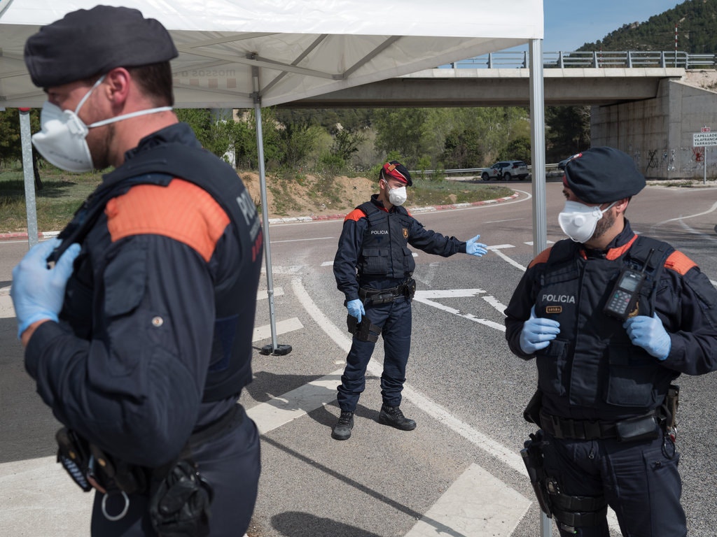 Los que viven dentro de Igualada y los que están fuera pueden reunirse en los puestos de control, pero solo para intercambiar bienes esenciales y supervisados por los agentes de policía. En una mañana reciente, Toni Navarro entregó aires acondicionados para el hospital a su colega Jordi Morente, quien vive en Igualada. Ambos llevaban máscaras y guantes.